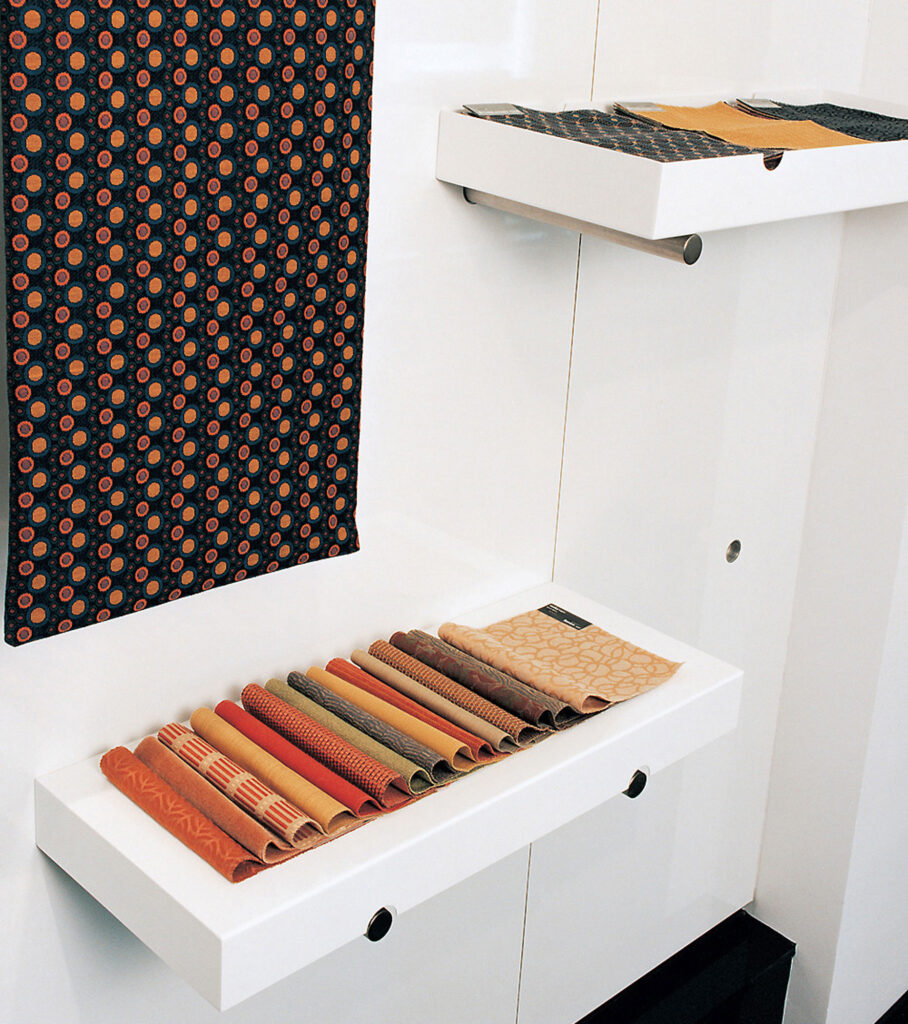 ICF New York and San Francisco had us create thick shelves that fit onto pog, which flipped over to create trays for smaller samples.