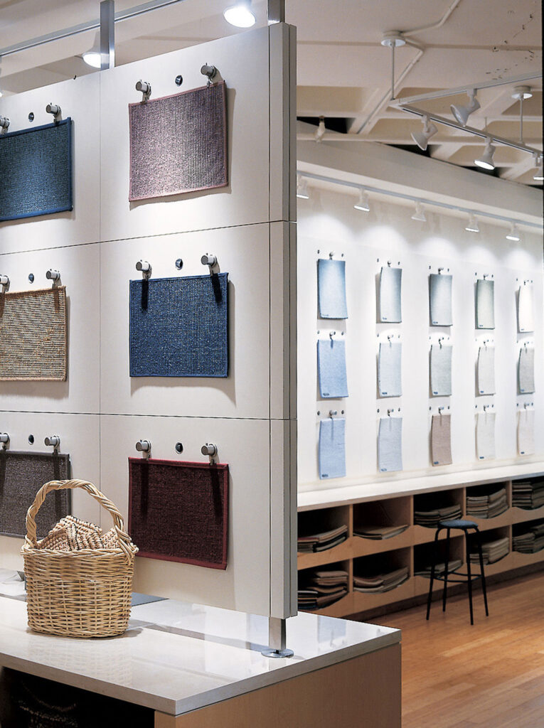 The showrooms for Mohawk carpet use Pog with Riggers (floor-to-ceiling supports specially designed for our panel systems) to create clean and isolated views of samples.