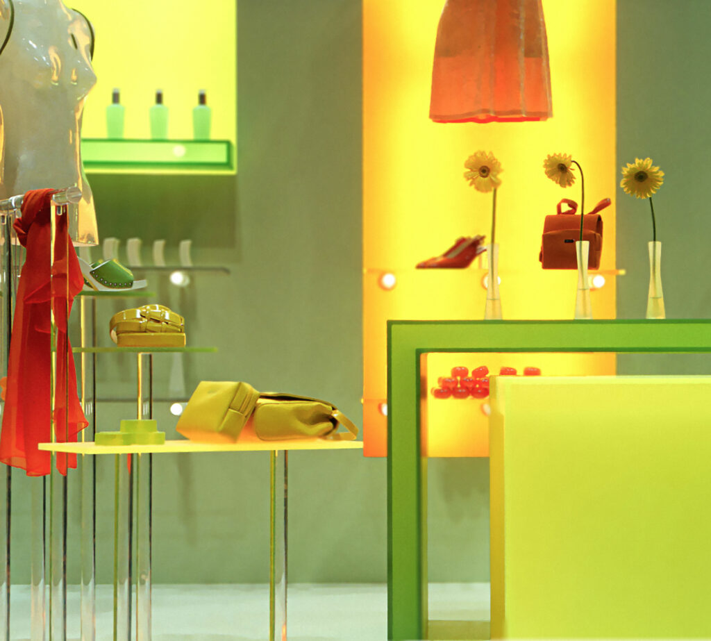 At Chanel, we created an innovative collection of Pog panels that are upholstered vegan leather and combined with clear acrylic hardware and shark-nose-edged, elliptical acrylic shelves.