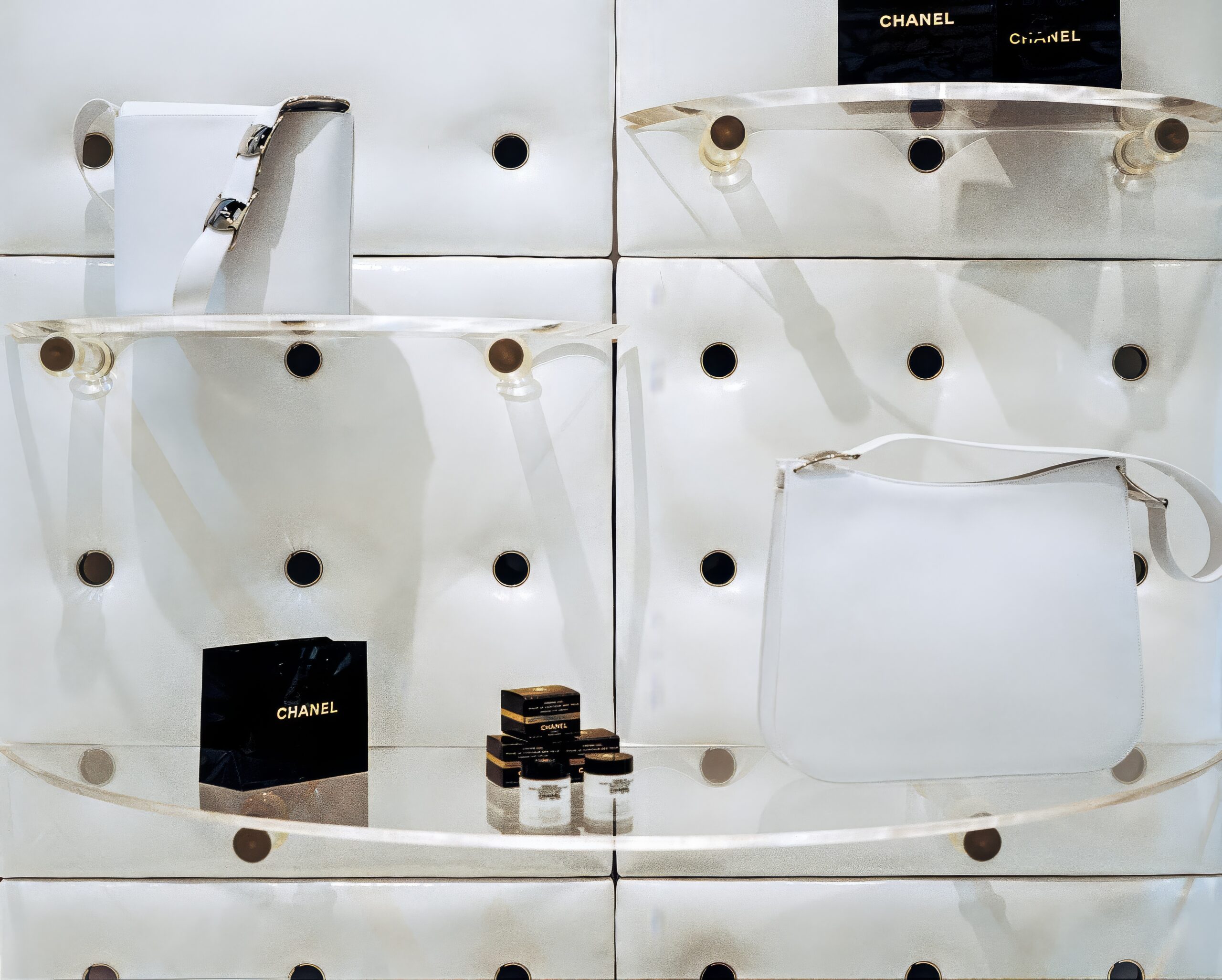 At Chanel, we created an innovative collection of Pog panels that are upholstered vegan leather and combined with clear acrylic hardware and shark-nose-edged, elliptical acrylic shelves.