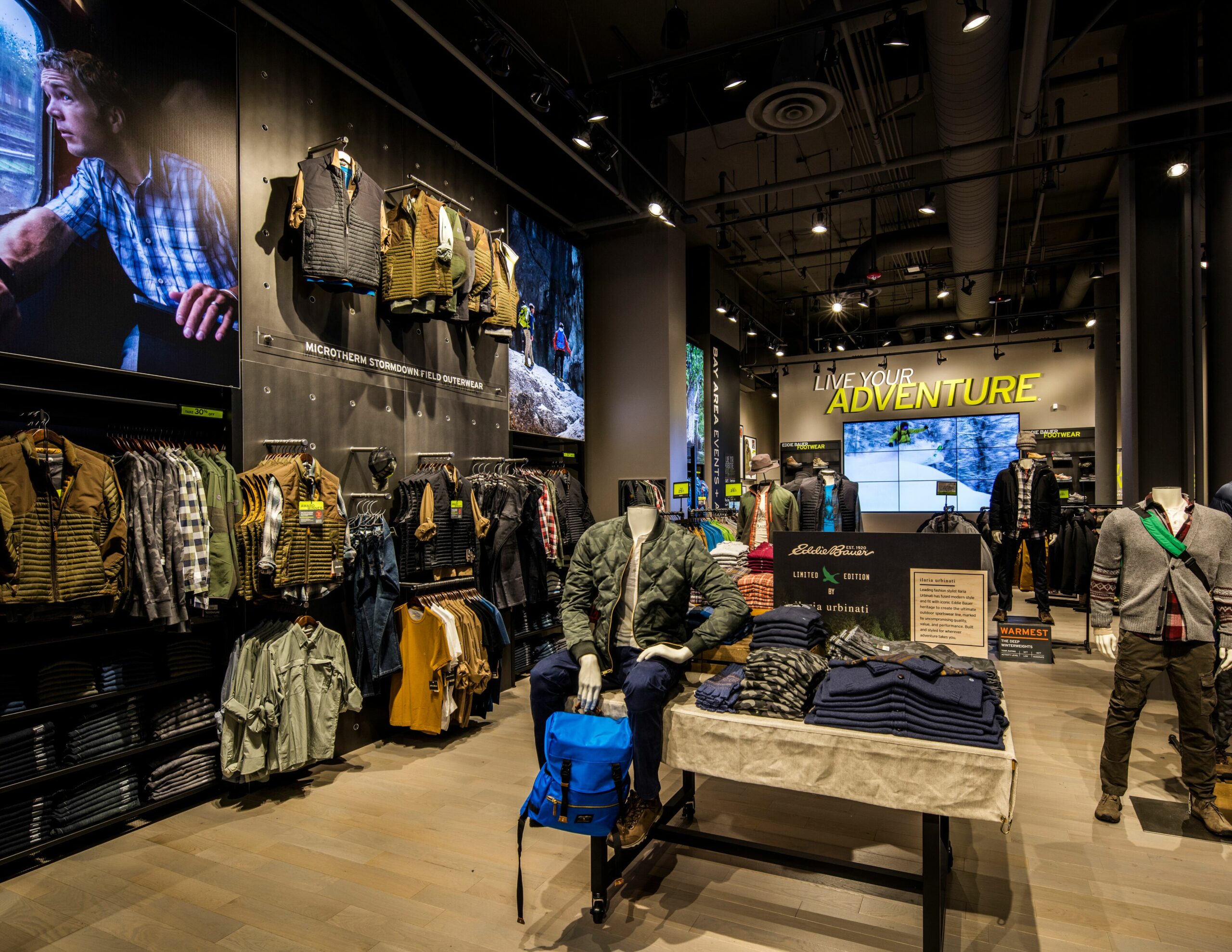 At Eddie Bauer, Pog panels are clad in a weathered concrete look, contrasting with the bright merchandise.