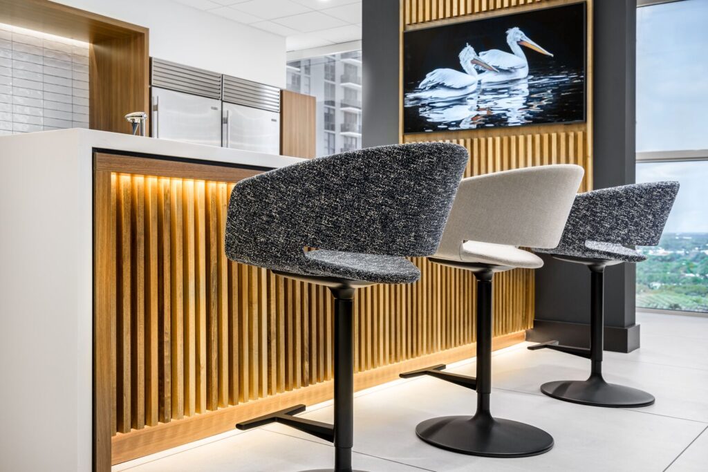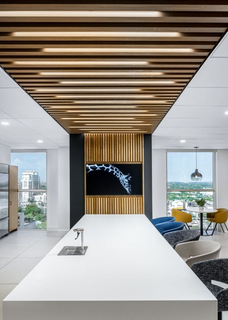 Right above and below, Auto Nation HQ defines meeting and casual gathering spaces with a consistent finish of Fortina.