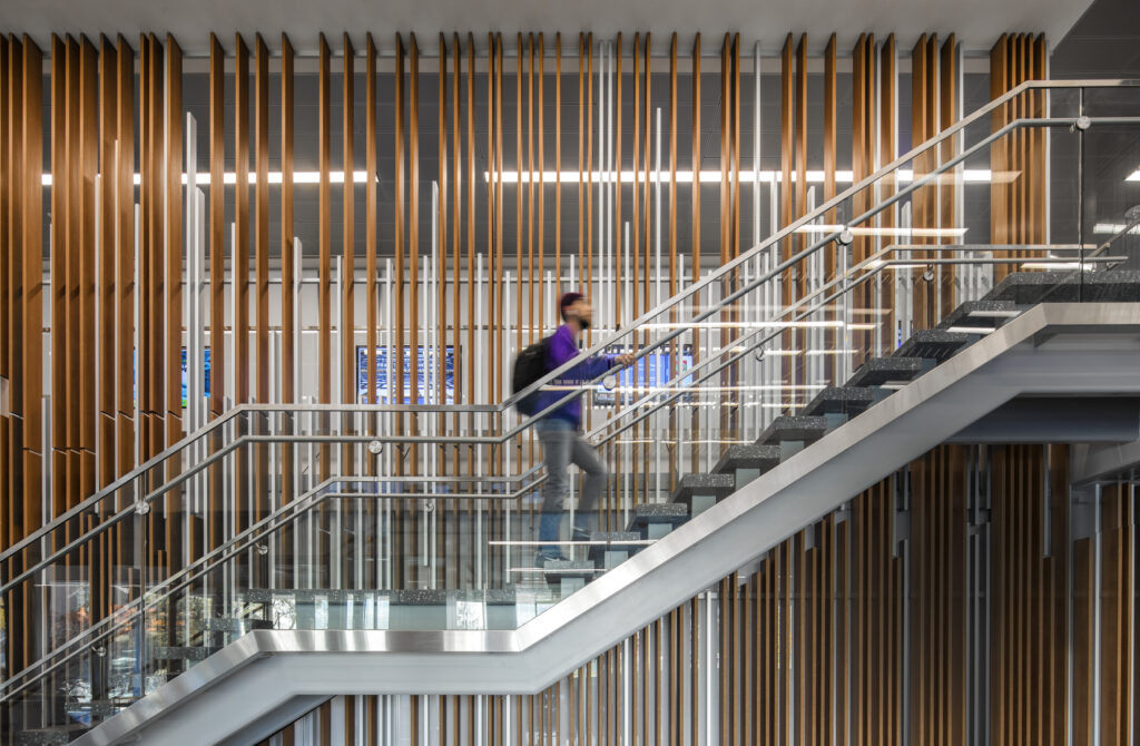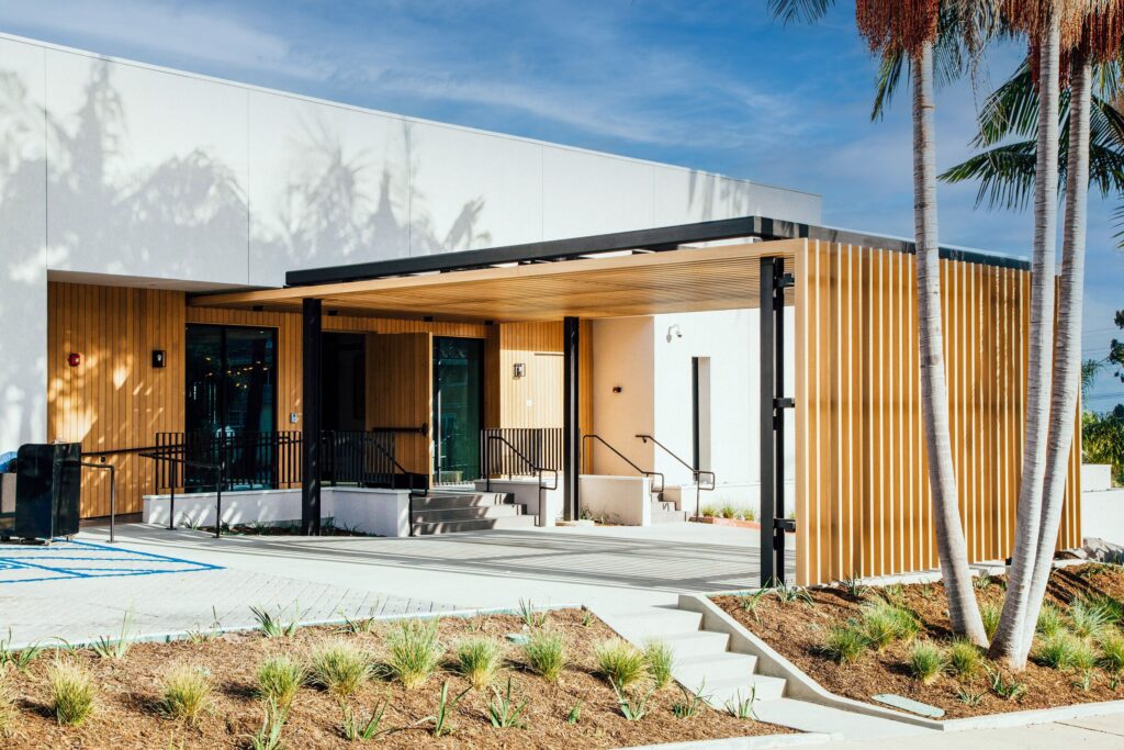 Above, for the Griffin Club’s outdoor entryway, the CCY Architects team initially considered natural wood for the building’s exterior, but those did not meet roofing code requirements. Natural wood also requires a refinishing process and regular upkeep, while Fortina does not.