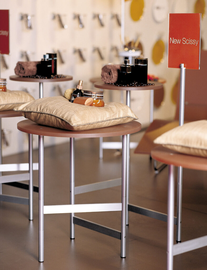 The ability for merchandise to exist without the encumbrance of heavy fixturing is the essence of Scissy. From simple wall bars, both vertical and horizontal, to tables and pedestals, Scissy can go from wall to floor.
