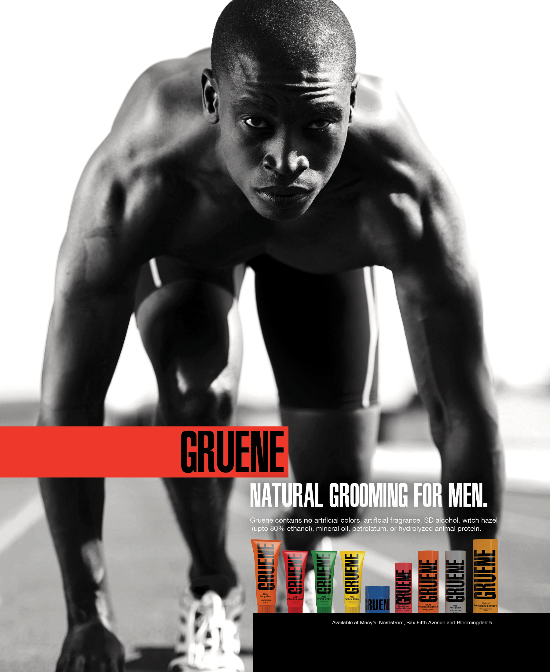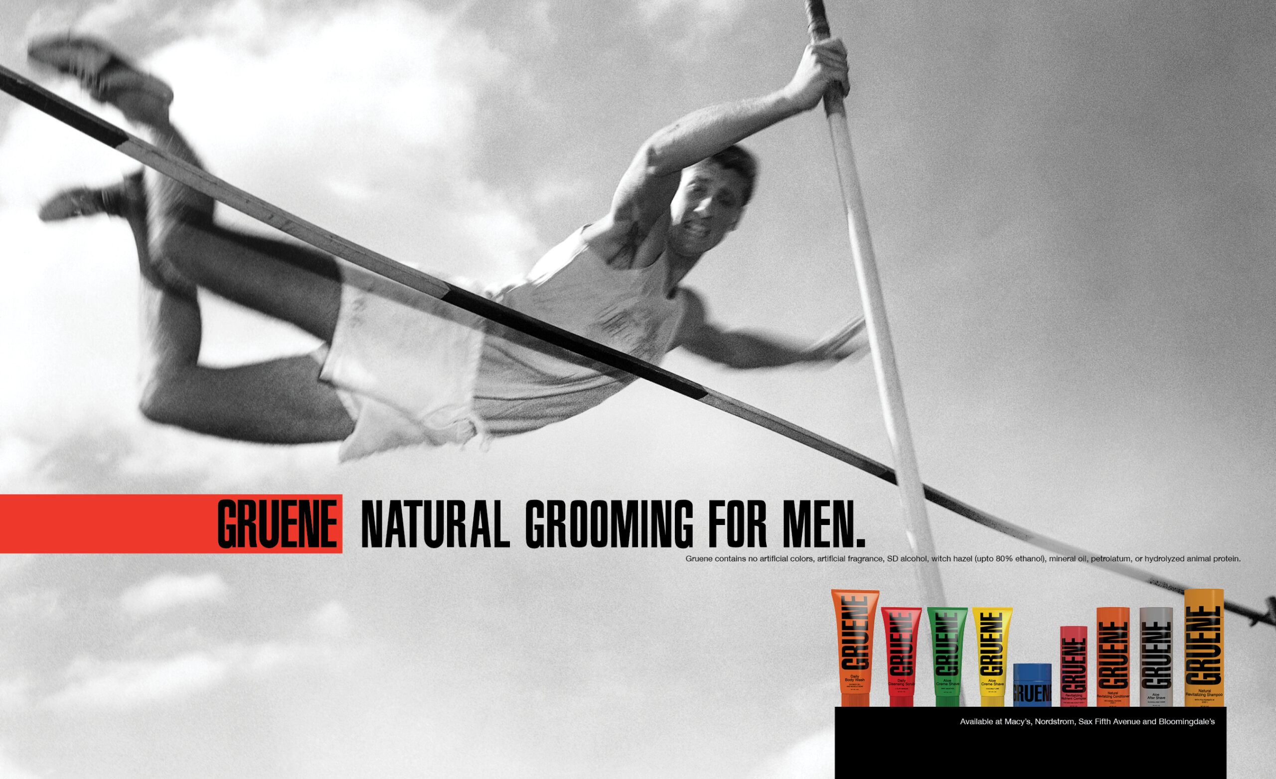 When men’s skincare was dominated by dull greens and grays, Gruene broke through with a vibrant, sporty identity—primary colors, bold type, and natural ingredients for the health-conscious man. They reframed skincare as part of total wellness, pairing eye-catching packaging with dynamic, sports-driven black-and-white imagery that made their products impossible to ignore.