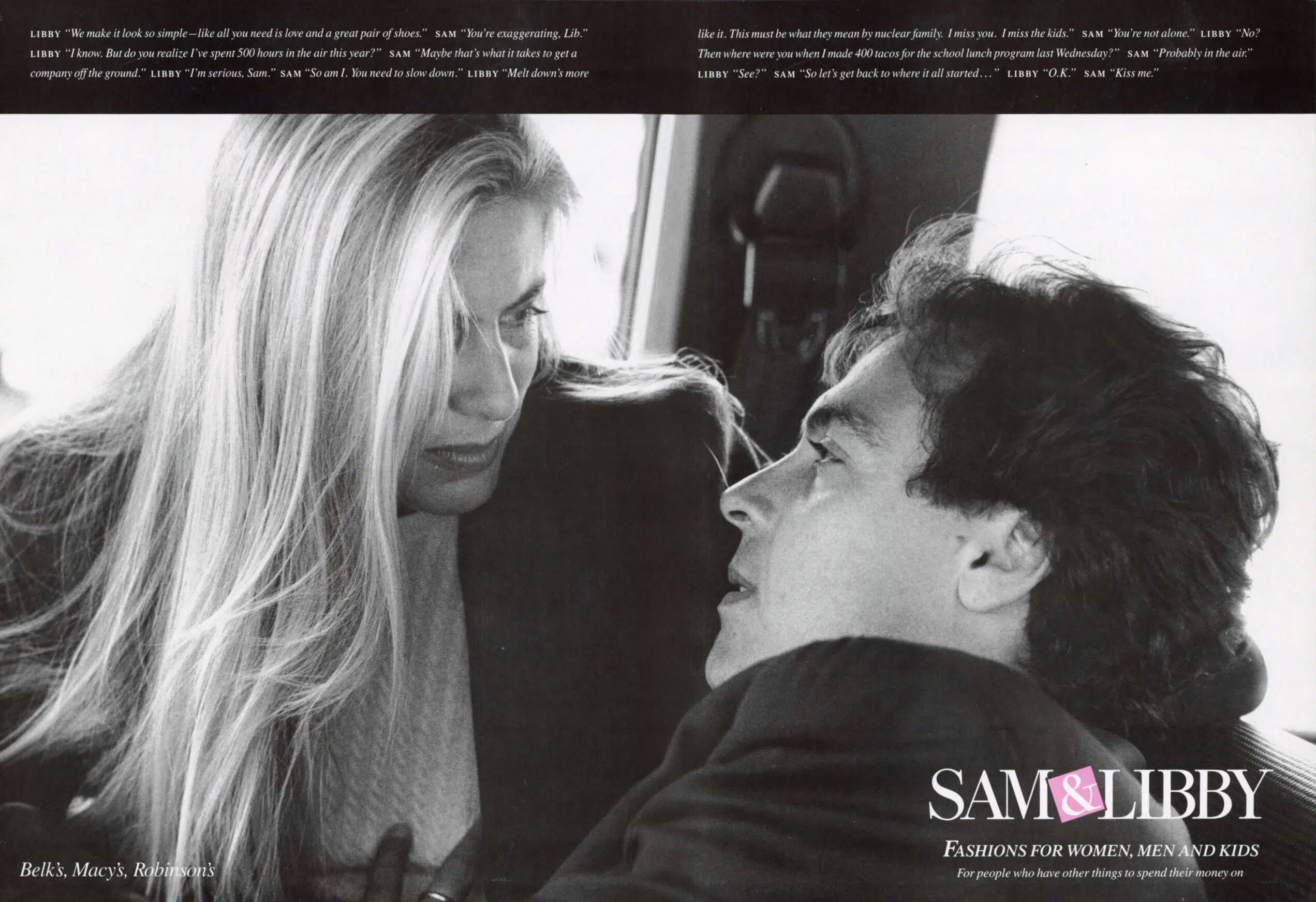 Building on this authentic foundation, we partnered with top photographers and copywriters to create black-and-white ads featuring candid dialogues and intimate imagery. A simple black bar with text reinforced the conversational tone, making each piece feel part of an ongoing story. The campaign resonated strongly—especially with baby boomers—cementing Sam & Libby’s image as authentic, relatable, and fashion-forward.