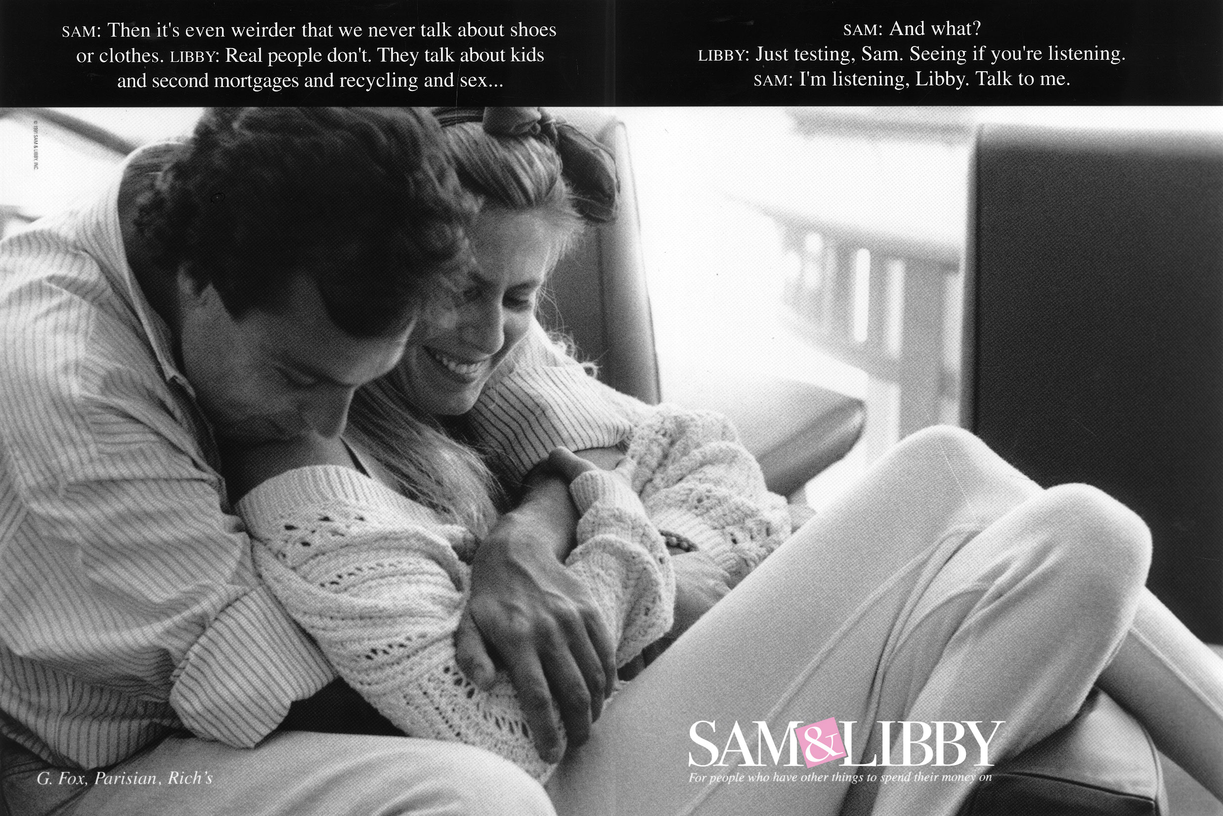Building on this authentic foundation, we partnered with top photographers and copywriters to create black-and-white ads featuring candid dialogues and intimate imagery. A simple black bar with text reinforced the conversational tone, making each piece feel part of an ongoing story. The campaign resonated strongly—especially with baby boomers—cementing Sam & Libby’s image as authentic, relatable, and fashion-forward.